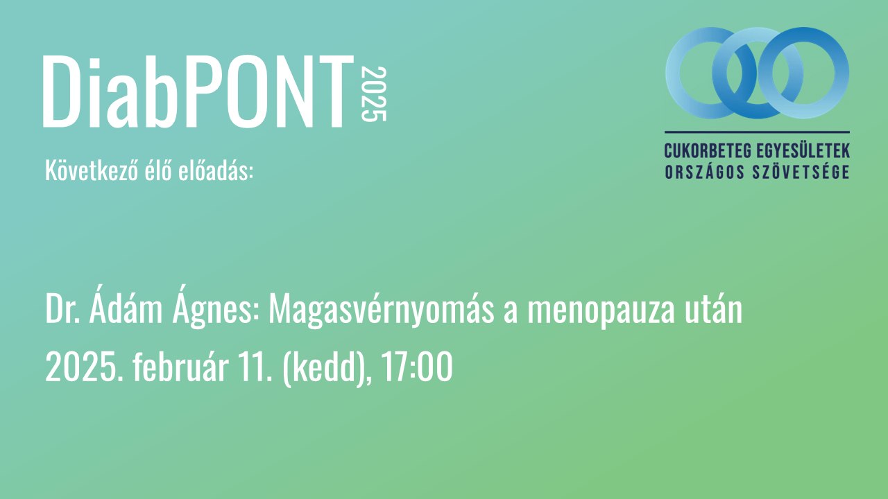 Szeretettel várunk kedden 17:00 órakor a soron következő DiabPONT előadáson, ahol Dr. Ádám Ágnes belgyógyász doktornő hívja fel a menopauza utáni magas vérnyomás veszélyeire a figyelmet.