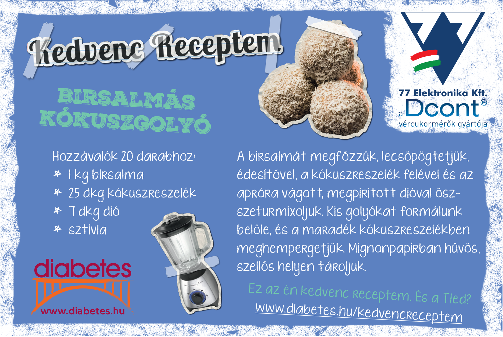 Játékra hívunk mindenkit, diabéteszeseket és egészségeseket, laikusokat és szakembereket (dietetikusokat, szakápolókat, egészségügyi dolgozókat) egyaránt. Töltsd fel vagy küldd el kedvenc ételeid leírását, amiket – dietetikusi kontroll után – közreadunk Receptsarok kiadványunkban!